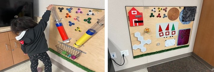 The sensory experiences provided by these walls help meet their individual sensory needs while promoting learning, focus, and interaction. One student in particular—a kindergartener who previously had difficulty engaging with toys and activities, and often struggled to remain at school for a full day—has shown remarkable improvement. She now interacts with the items on the board, especially the mirror and the sequin patch, and stays engaged throughout the day.